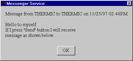 | Here is example of a message delivered from computer THERMIC to computer THERMIC. (That's the last degree of schizophrenia: to send messages to yourself). | ![]() |