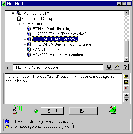 should be running. The picture from the right is the main window of Net Hail. Just select a computer or group, type in a message and press "Send" button. Sorry, but no help is available for this program. Use rigth button on group or domain to rescan it. The program is free for non-commercial use. For details read the License Agreement when you start installation. You should send a message to the author of Net Hail to register your copy. If you don't, you'll end up with old version of Net Hail ! You can find e-mail address in "About" dialog box. Press F1 to open this dialog. Or you can use this page to register Net Hail right away. |